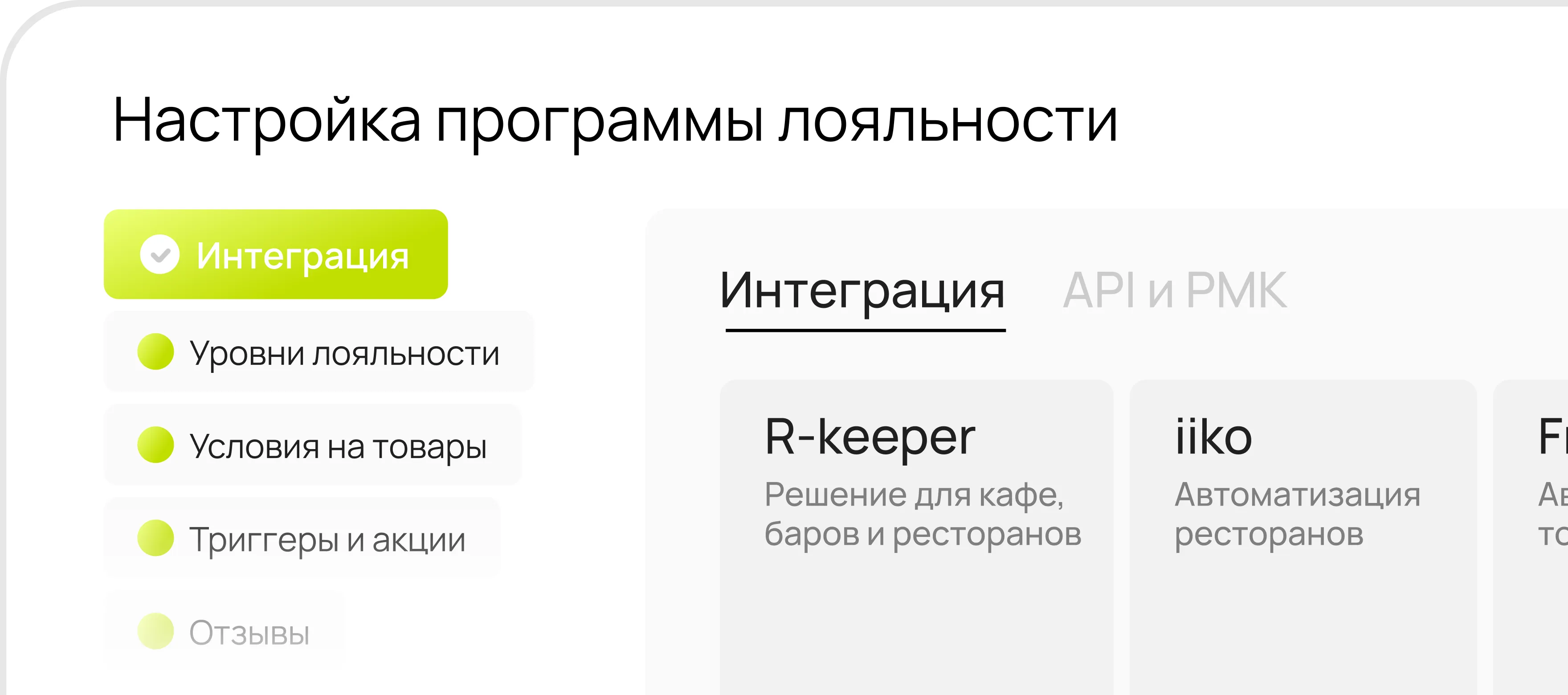 С помощью готовых интеграционных решений для большинства CRM-систем вы сможете легко и без лишних забот внедрить программу лояльности в бизнес.
