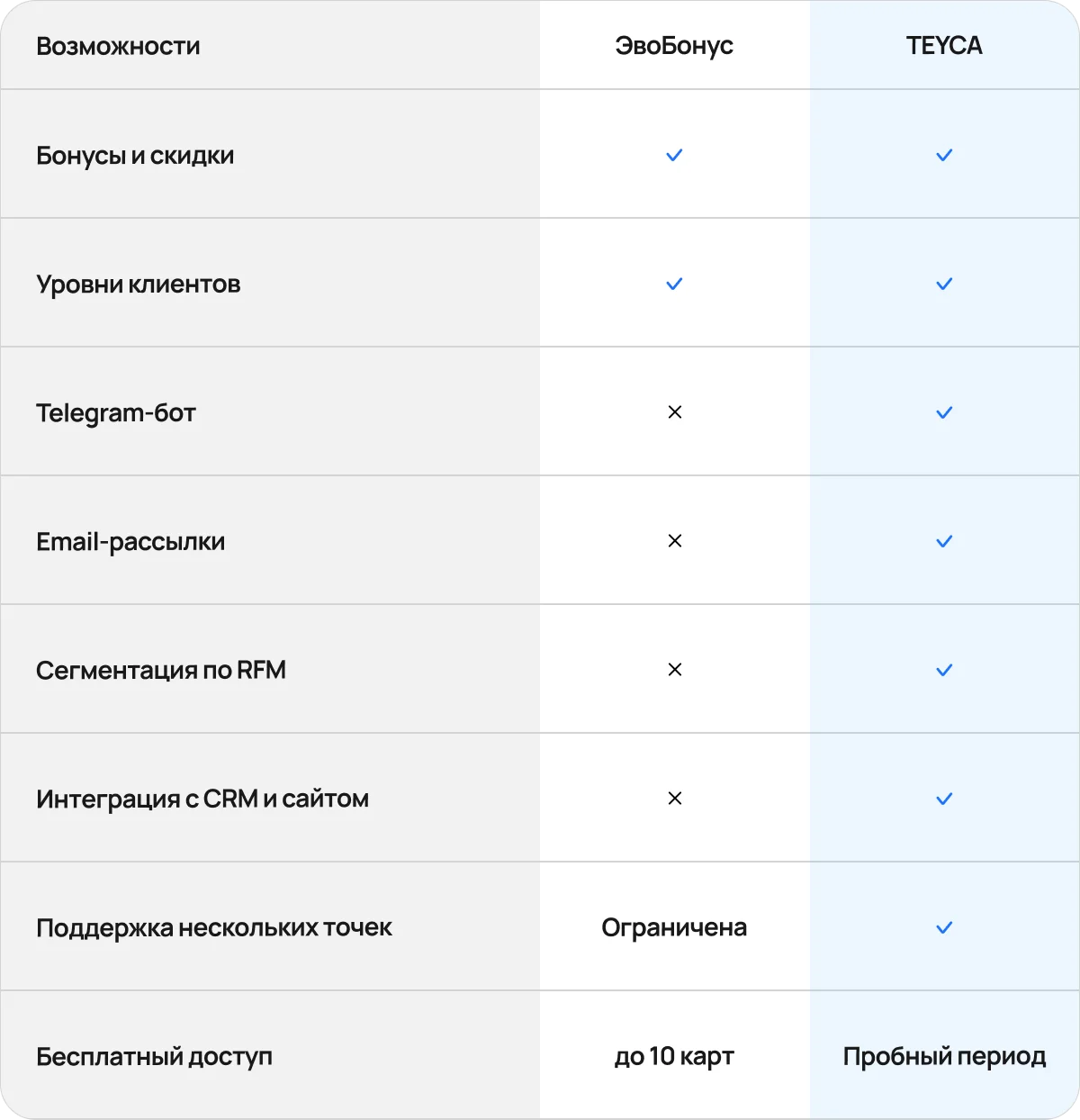 ЭвоБонус - хороший вариант для простого запуска. Тейка подойдёт, если вы хотите работать с клиентской базой более системно, развивать сеть или снизить затраты на коммуникации.